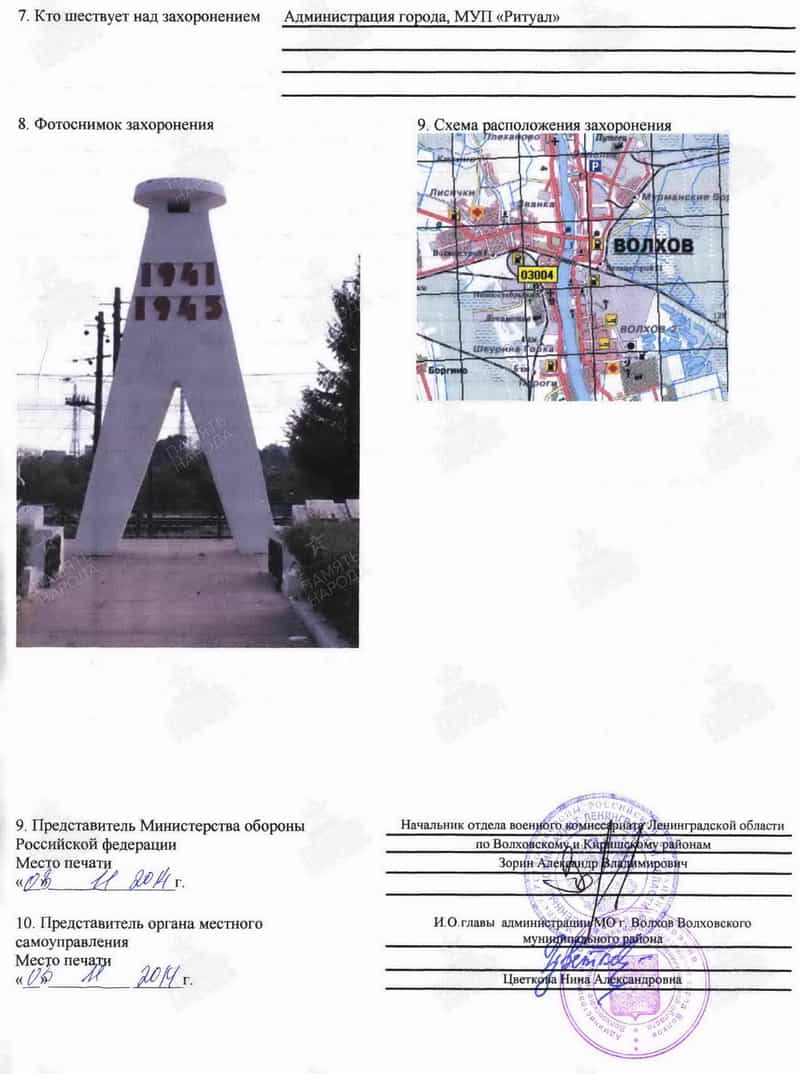 Перезахоронен на Мемориальном кладбище г. Волхова Ленинградской области, на южной окраине левобережной стороны Новооктябрьского кладбища (Захоронение № 88045676).