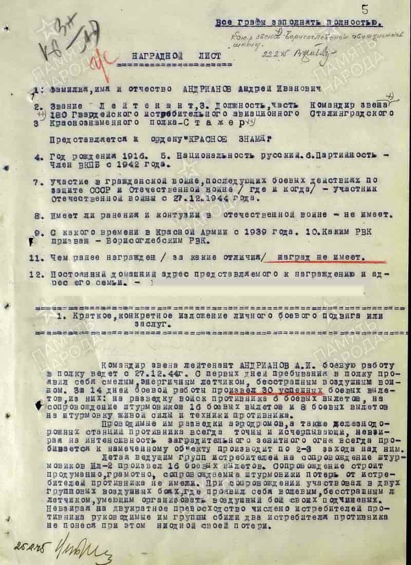 На 17.02.1945 стажёр, командир звена 180 гиап лейтенант Андрианов А.И. выполнил 30 боевых вылетов (по данным наградного листа).