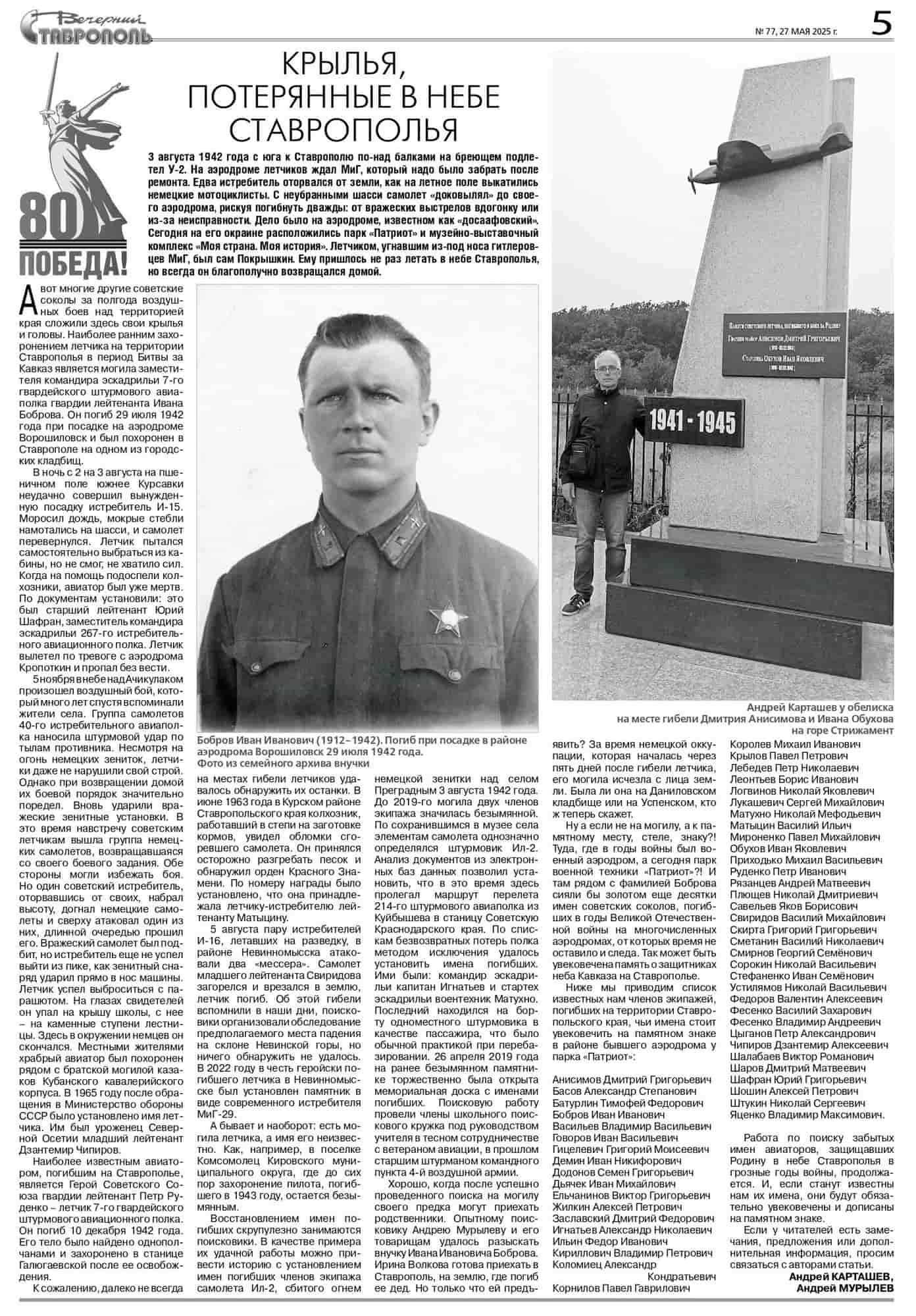 29 июля 1942 года заместитель командира эскадрильи 7 гшап гвардии лейтенант Бобров Иван Иванович погиб при выполнении боевого задания, при посадке на аэродроме г. Ворошиловска.