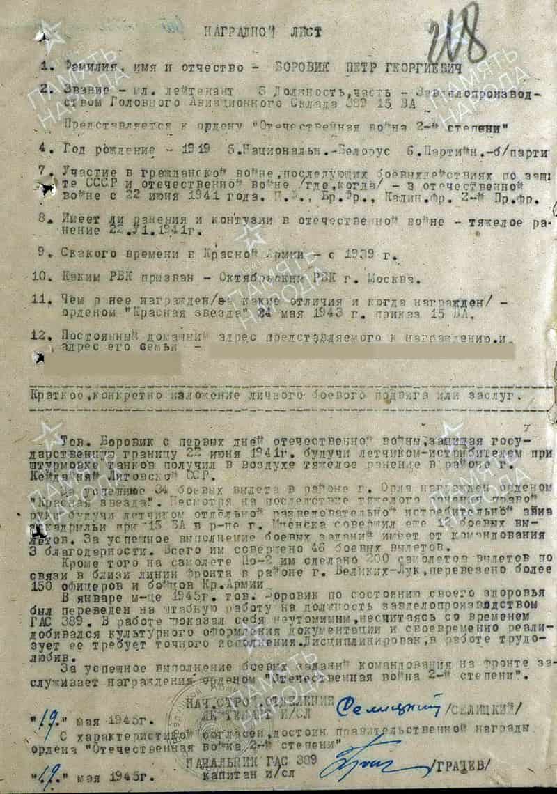 В январе 1945 года младший лейтенат Боровик П.Г. по состоянию здоровья был переведён на штабную работу на должность заведующего делопроизводством Головного авиационного склада № 389.