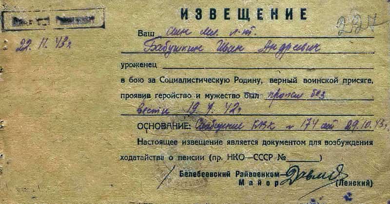 Жена Бабушкина Вера Даниловна проживала в с. Петровское Борисоглебского района Воронежской области.