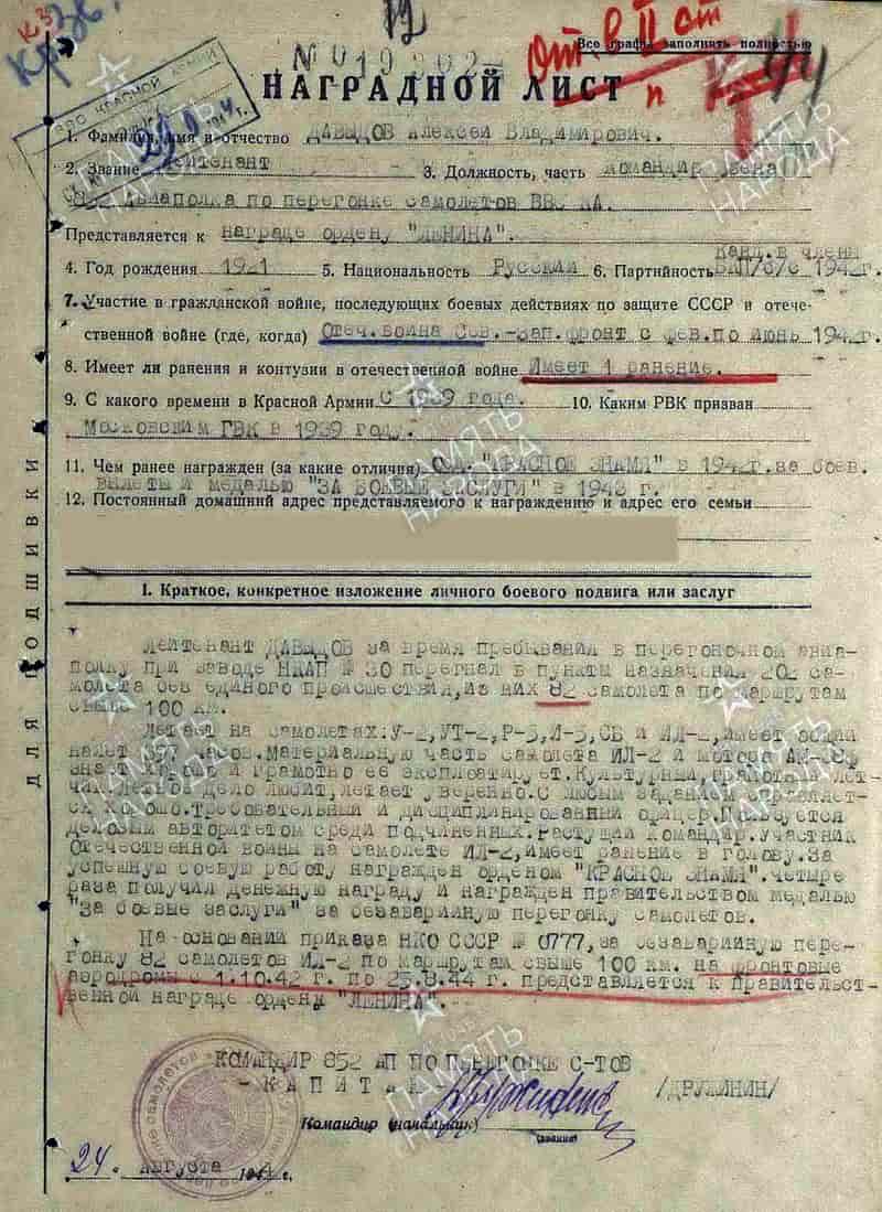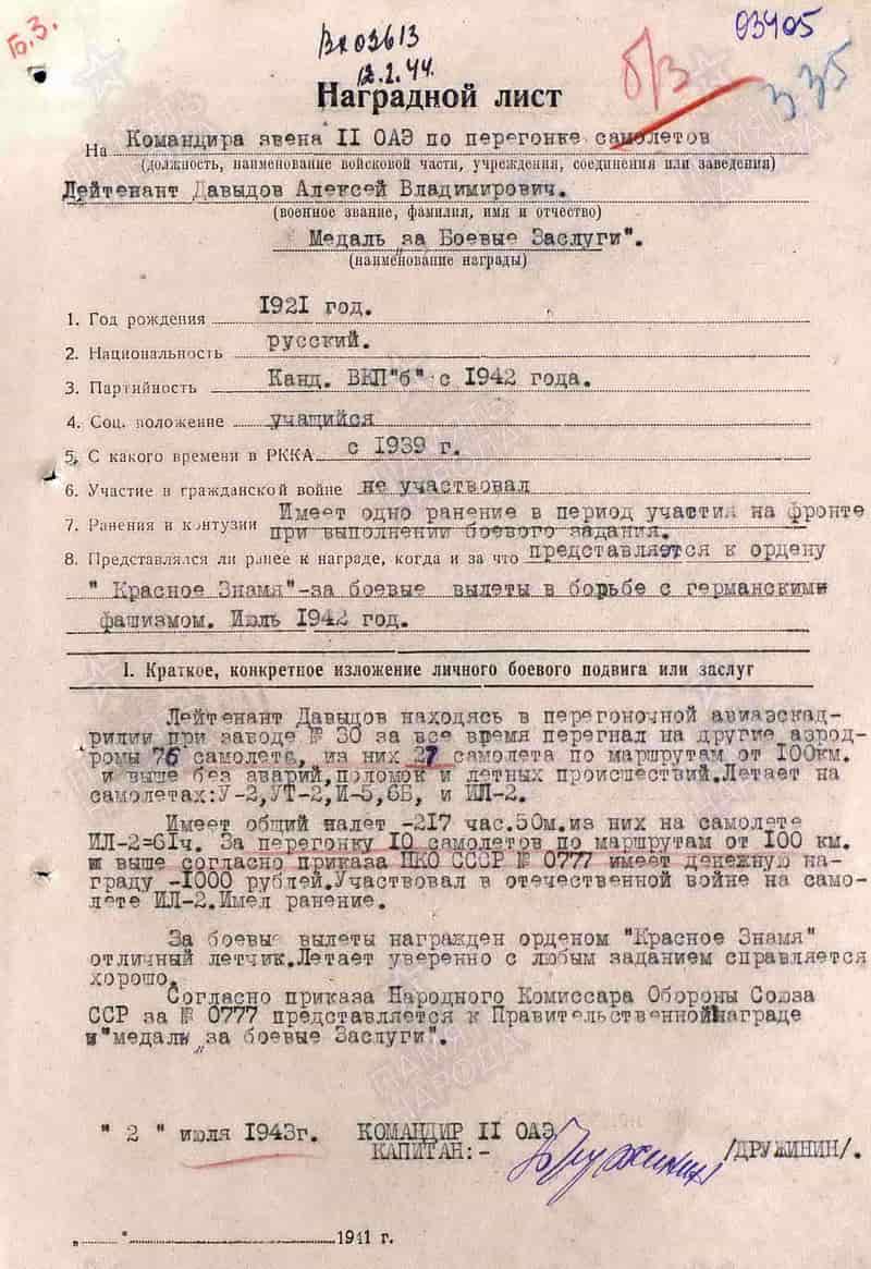 В дальнейшем Давыдов Алексей Владимирович служил в 11-й отдельной авиационной эскадрильи по перегонке самолётов при заводе № 30 в г. Москве.