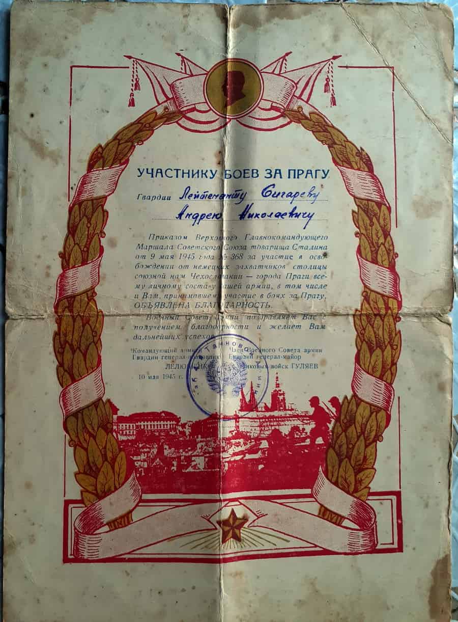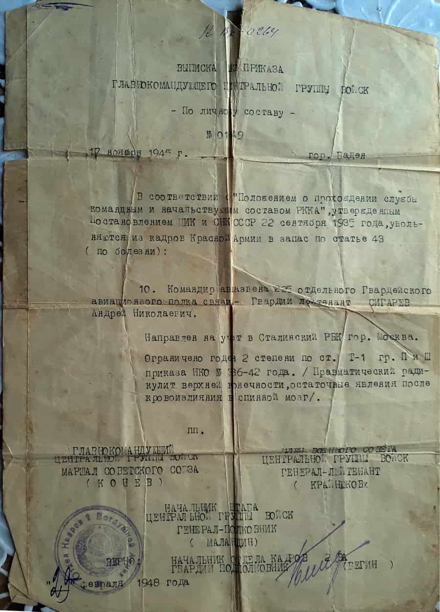 17 ноября 1945 года лейтенант Сигарёв Андрей Николаевич уволен в запас по ст. 43 (по болезни) приказом Главнокомандующего Центральной группы войск и направлен на учёт в Сталинский РВК г. Москвы.