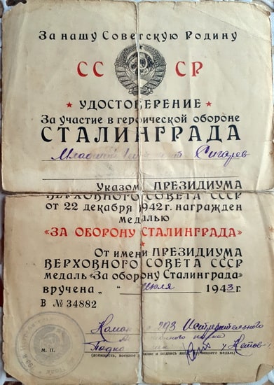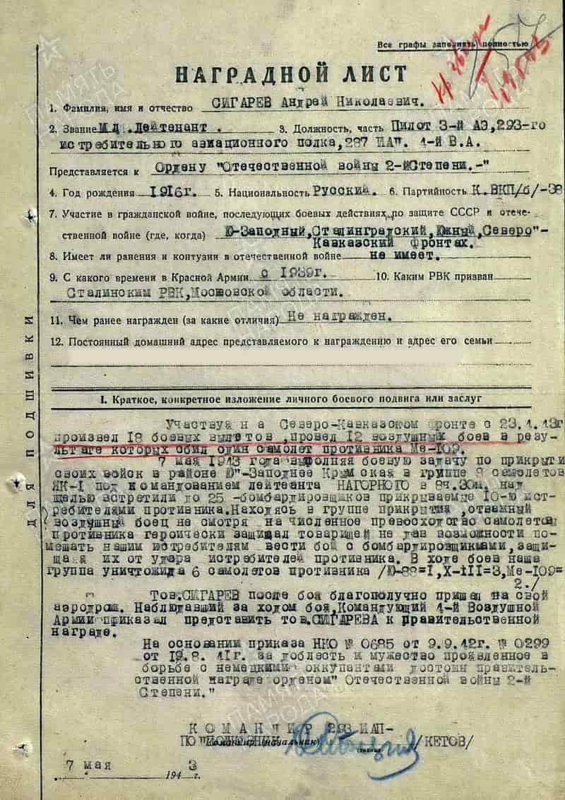 07.05.1943 пилот 3-й эскадрильи 293 иап 287 иад 4-й ВА Северо-Кавказского фронта младший лейтенант Сигарёв А.Н. представлен к награде.