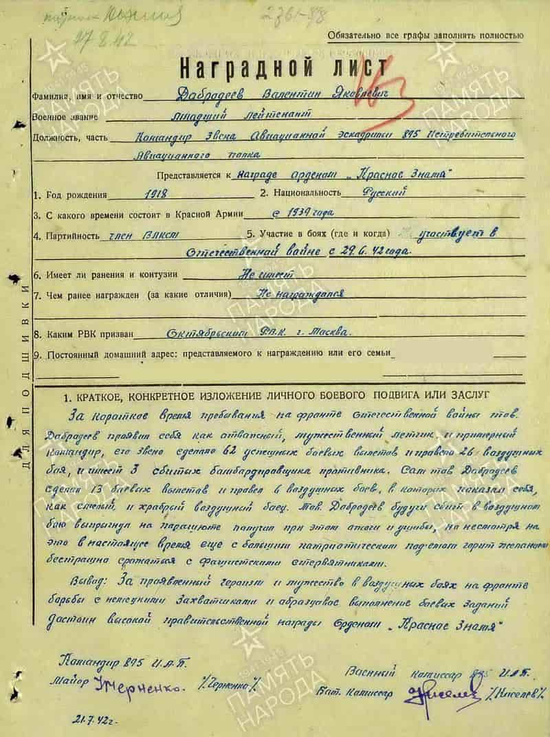 На 21.06.1942 — младший лейтенант, командир звена 895 иап.