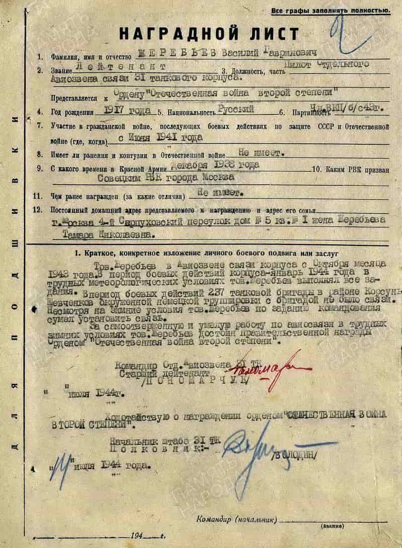 14.07.1944 пилот отдельного авиационного звена связи 31-го Танкового корпуса 1-го Украинского фронта лейтенант Жеребьёв Василий Гаврилович представлен к награде.