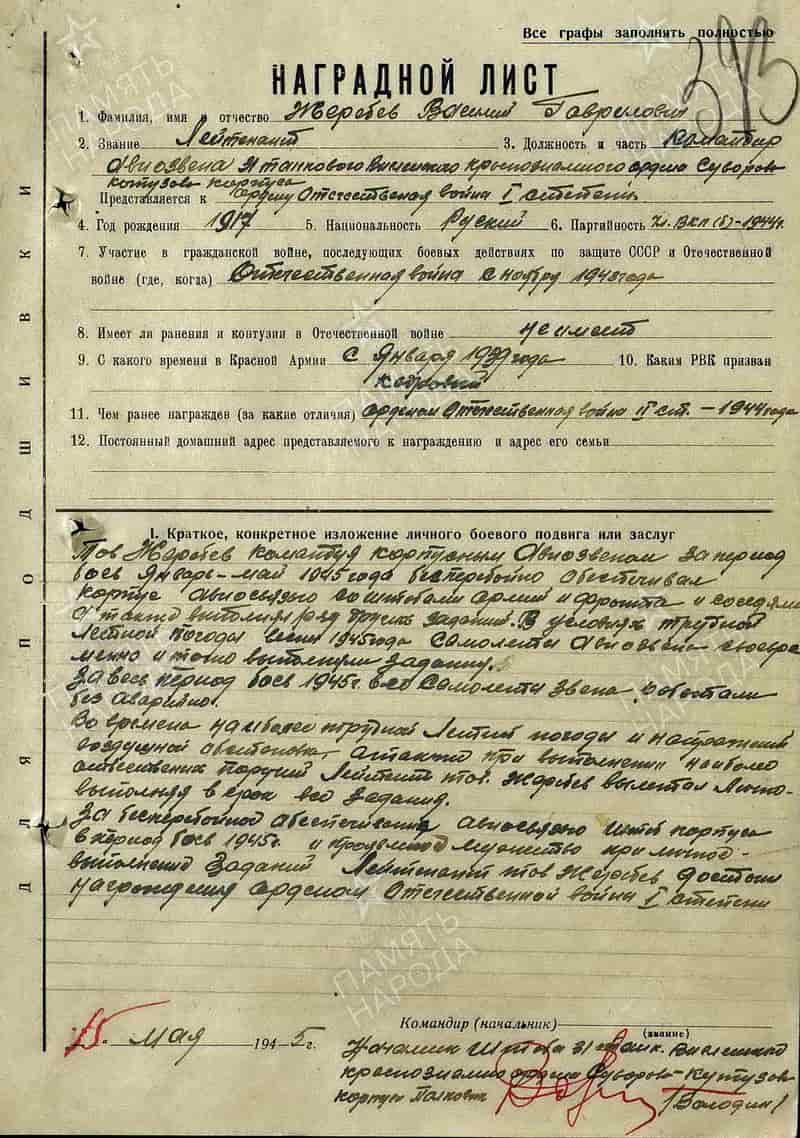 15.05.1945 пилот отдельного авиационного звена связи 31-го Танкового корпуса 60-й Армии лейтенант Жеребьёв Василий Гаврилович, представлен к награде.