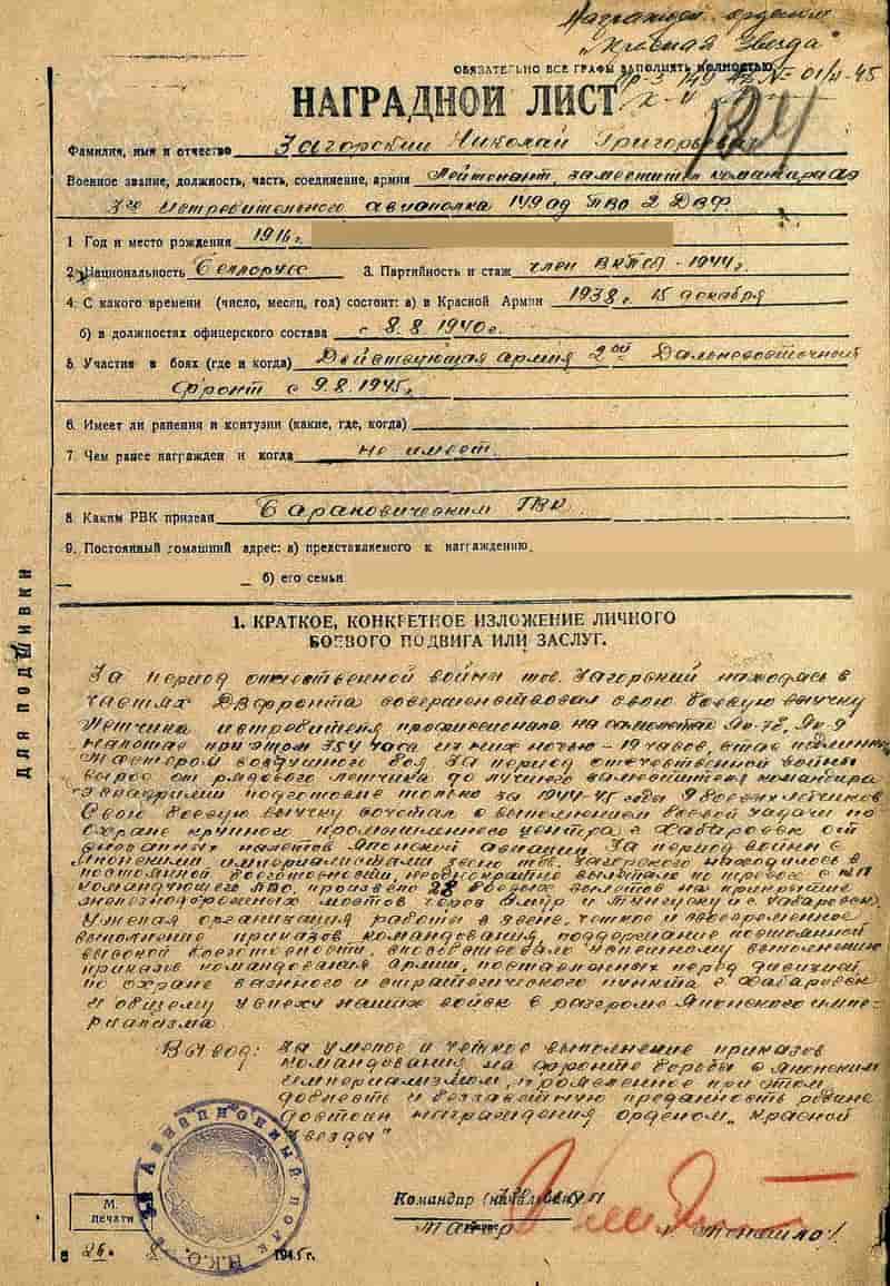 26.08.1945 заместитель командир эскадрильи 3-го иап лейтенант Загорский Н.Г. представлен к награде.