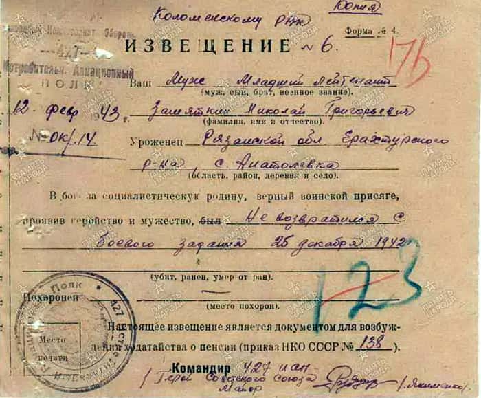 25 декабря 1942 года командир звена 427 иап младший лейтенант Замяткин Николай Григорьевич не вернулся с боевого задания, пропал без вести.
