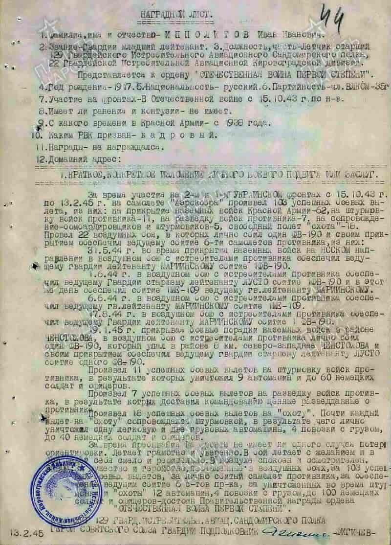 13.02.1945 лётчик старший 129-го гвардейского иап 22 гиад 6 гиак 2-й ВА 1-го Украинского фронта гвардии младший лейтенант Ипполитов Иван Иванович представлен к награде: