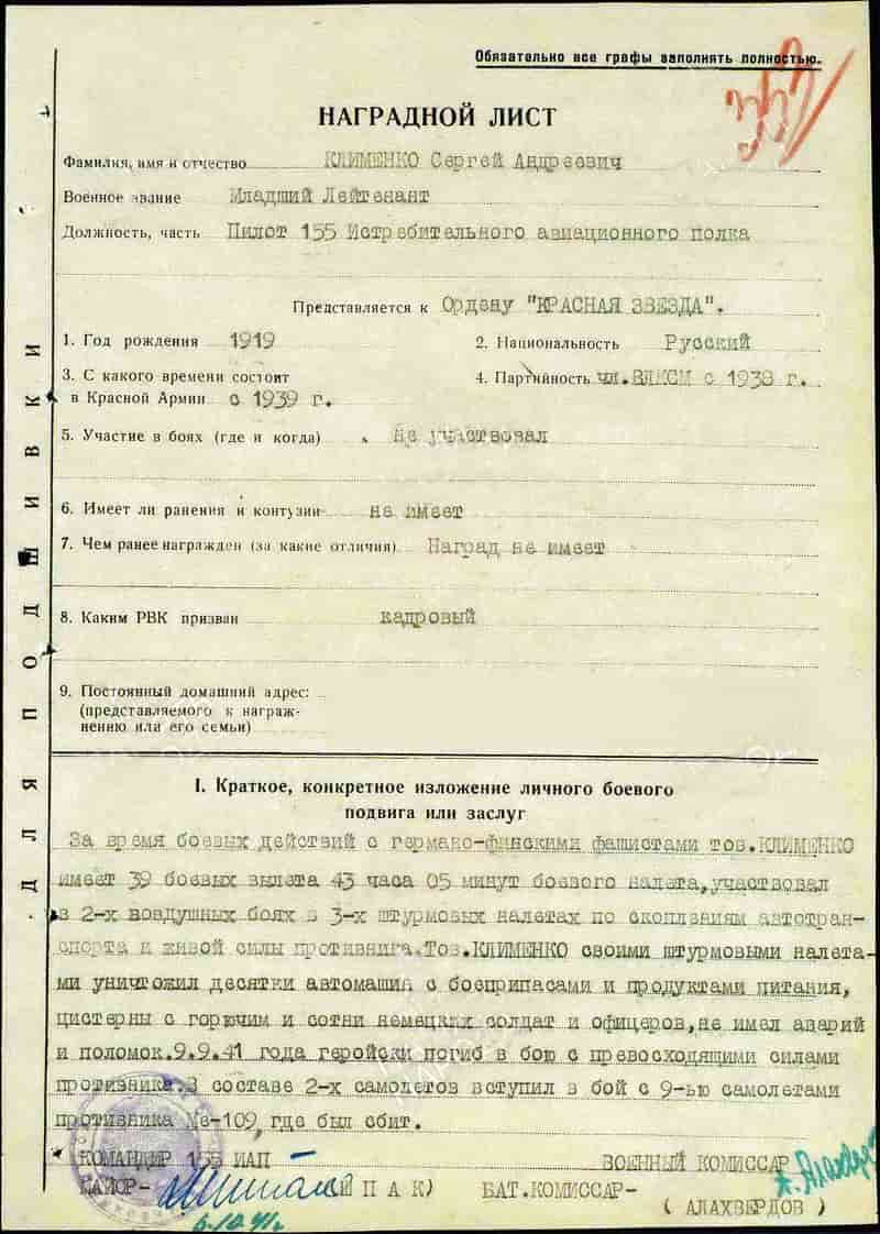 Пилот 155 иап младший лейтенант Клименко Сергей Андреевич погиб 9 сентября 1941 года - сбит в воздушном бою на самолёте И-16.
