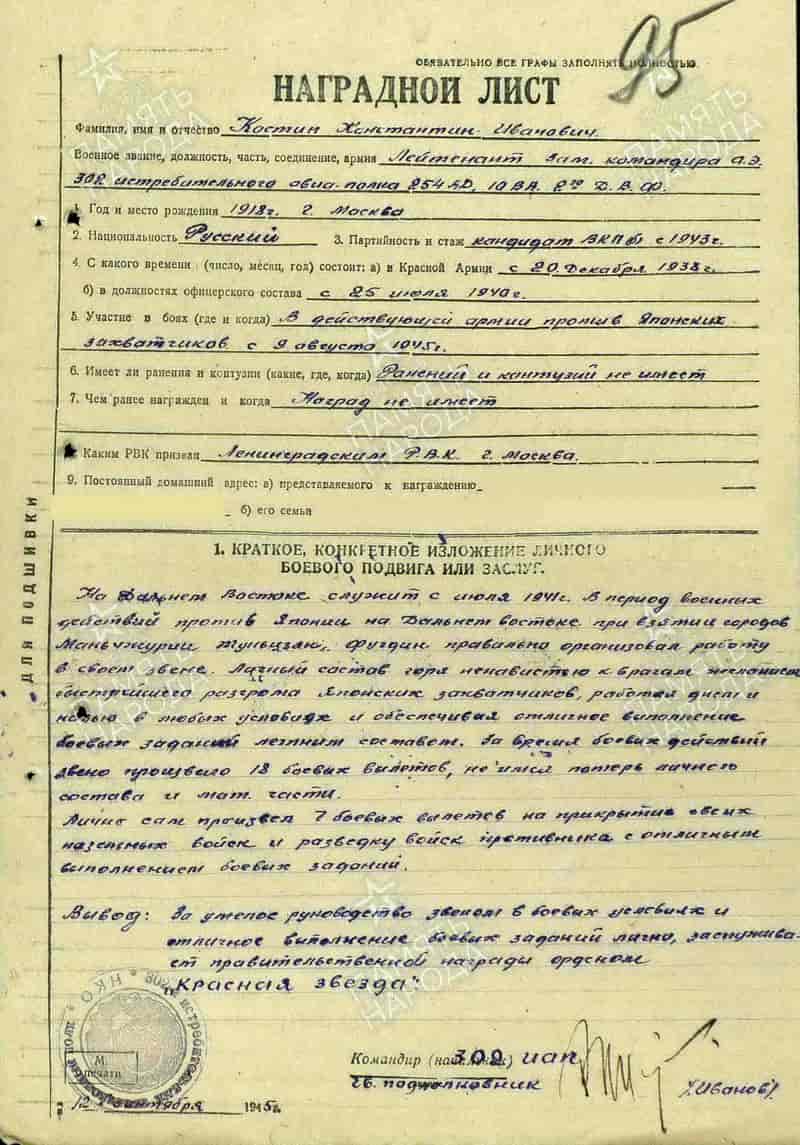 12.09.1945 заместитель командира эскадрильи 302-го иап л-т Костин К.И. представлен к награде: