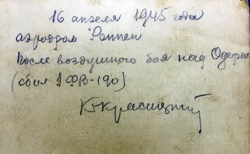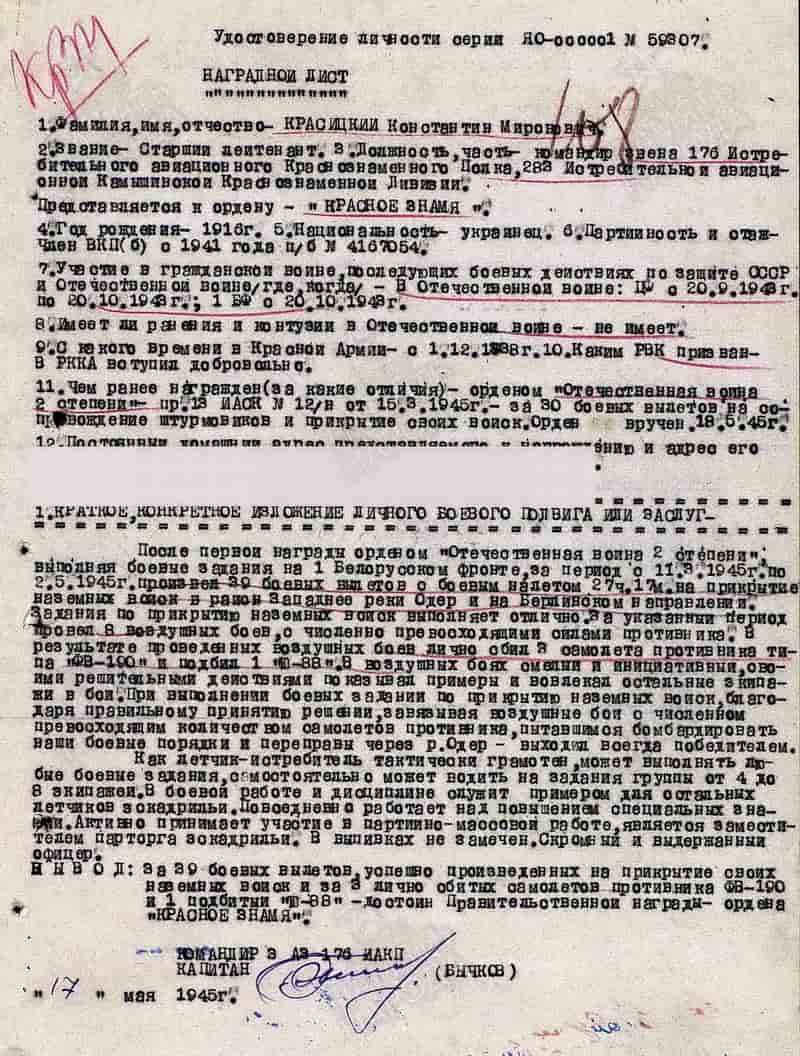 17.05.1945 командир звена 176-го иап старший лейтенант Красицкий К.М. представлен к награде. ПО данным наградного листа за время боевых действий выполнил 39 боевых вылетов, в 3 воздушных боях сбил лично 1 самолёт противника ВФ-190.