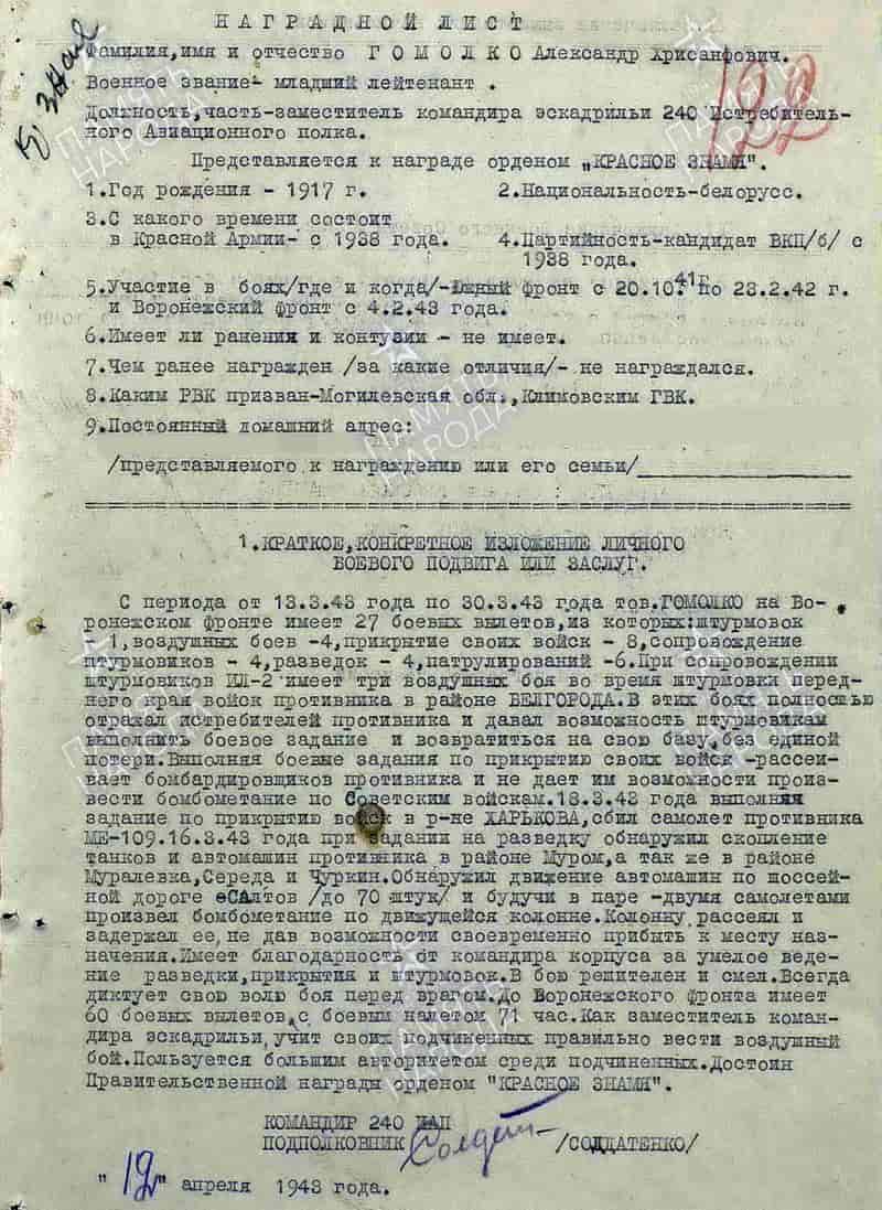 12.04.1943 заместитель командира эскадрильи 240 иап младший лейтенант Гомолко А.Х. представлен к награде.