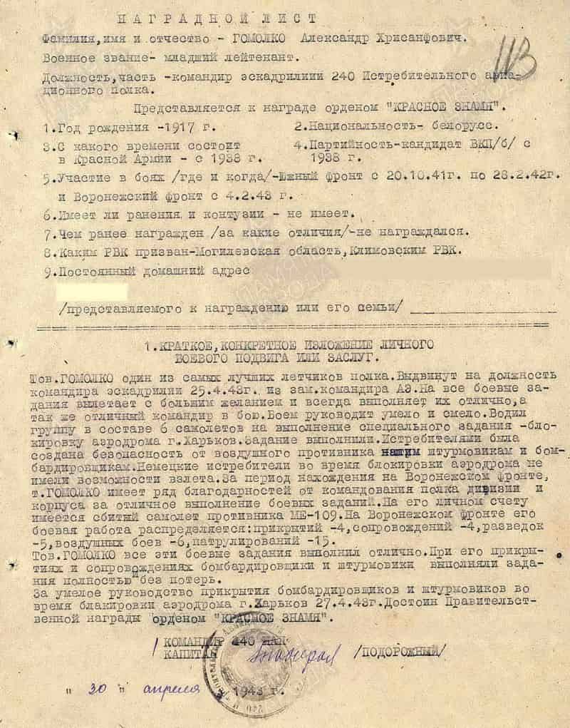 30.04.1943 командир эскадрильи 240 иап младший лейтенант Гомолко А.Х. представлен к награде.