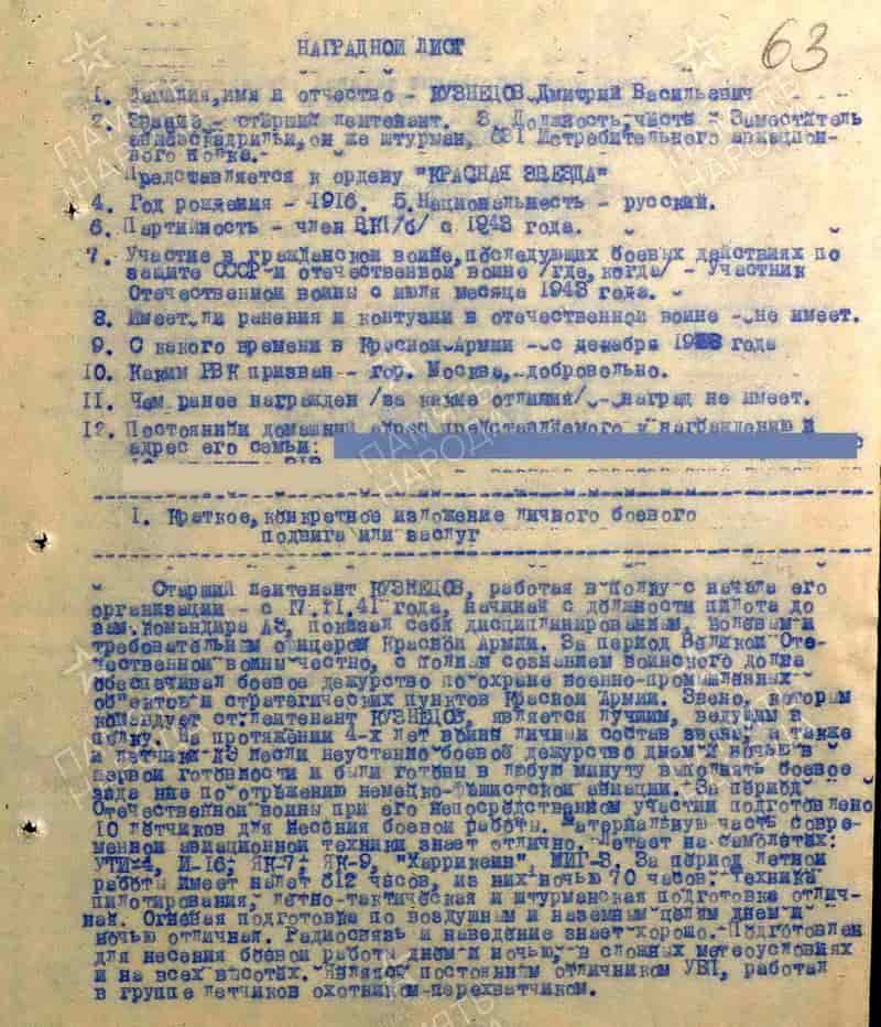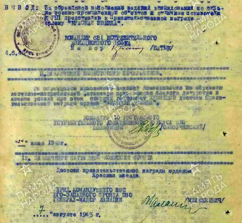04.06.1945 заместитель командира, штурман эскадрильи 631 иап ПВО старший лейтенант Кузнецов Д.В. представлен к награде.