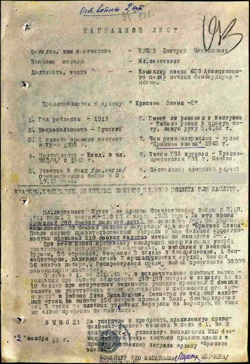 02.11.1943 командир звена 629-го нбап 208 нбад 2-й ВА 1-го Украинского фронта мл. л-т Кукин Д.М. представлен к награде.