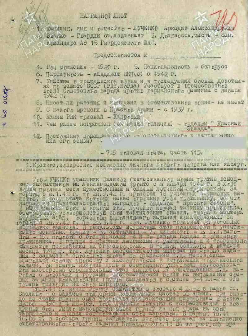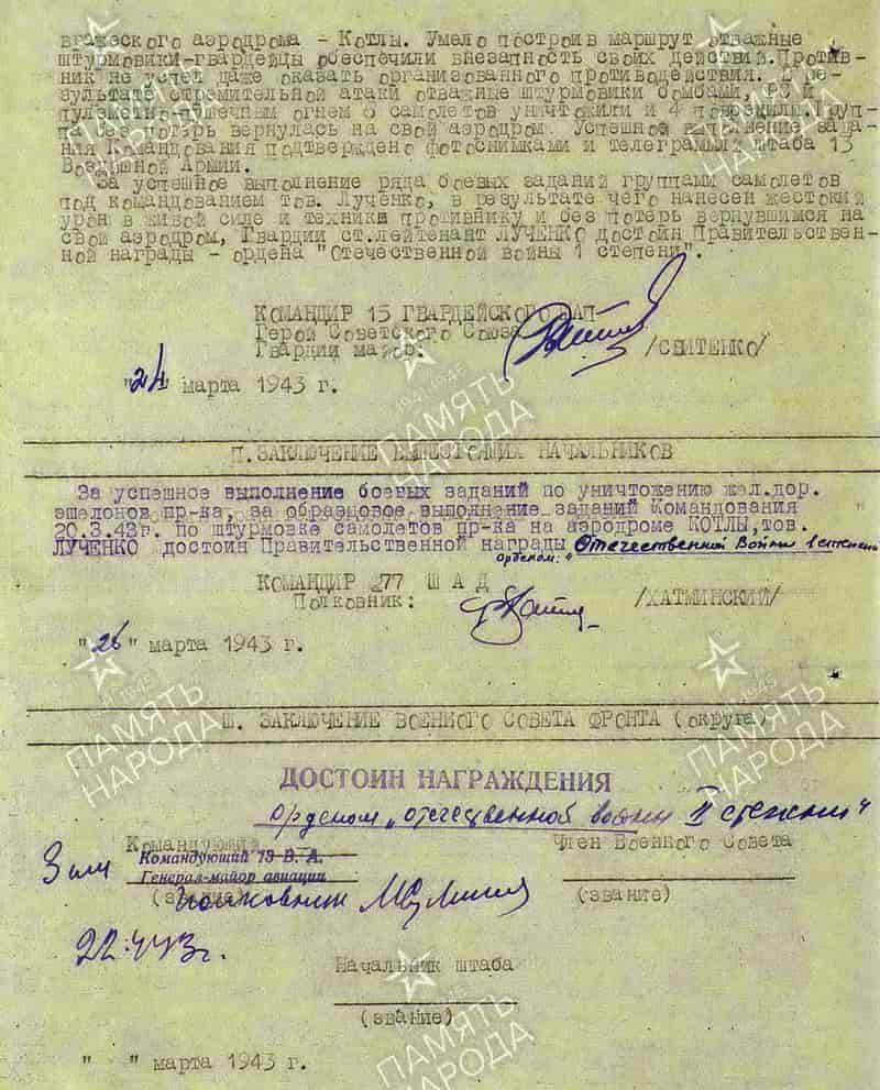 24.03.1943 заместитель командира эскадрильи 15 гшап гвардии старший лейтенант Лученко А.А. представлен к награде.