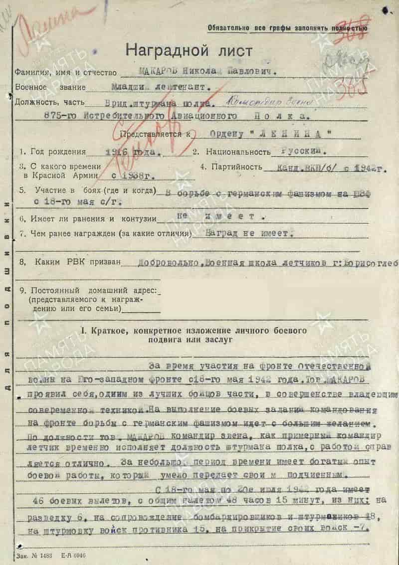 21.07.1942 командир звена, врид штурмана 875 иап представлен к награде.