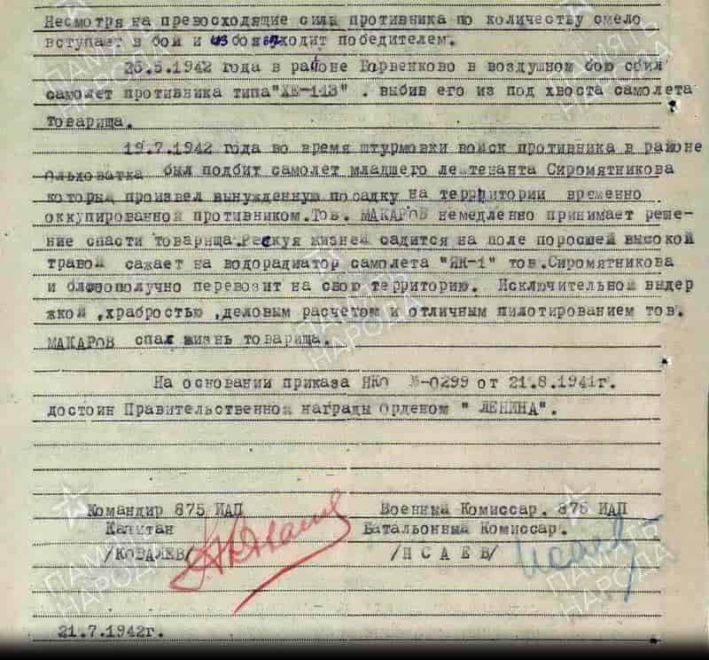 В дальнейшем, с 12.07.1942 по 03.08.1942 младший лейтенант Макаров Н.П. воевал в составе 875 иап 220 иад 8-й ВА Сталинградского фронта.