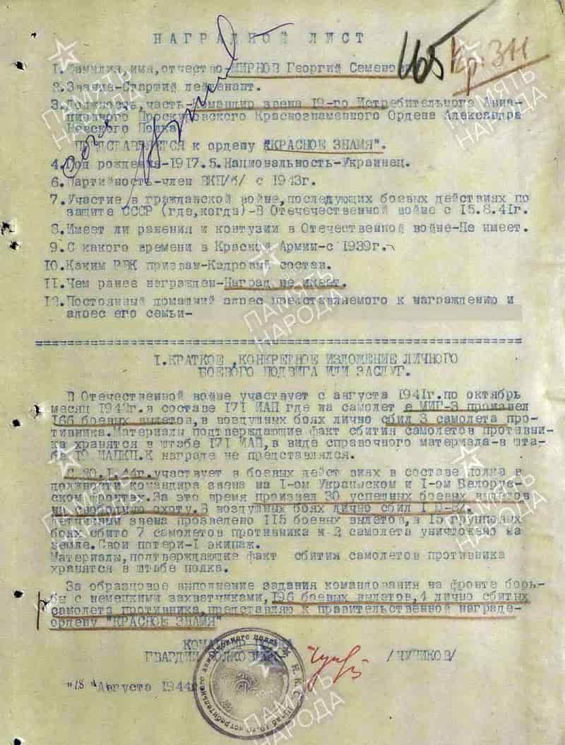 18.08.1944 командир звена 19-го иап 6-й ВА 1-го Белорусского фронта старший лейтенант Мирнов Г.С. представлен к награде.