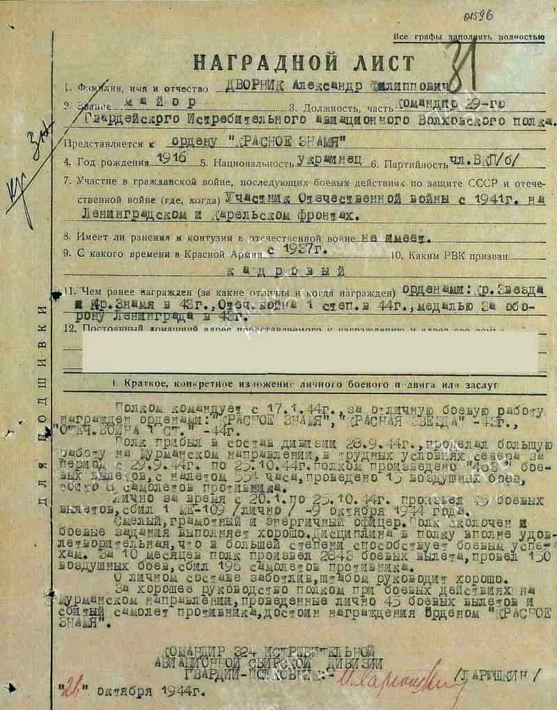 26.10.1944 командир 29-го гвардейского иап 257 иад 7-й ВА Карельского фронта гвардии майор Дворник А.Ф. представлен к награде.