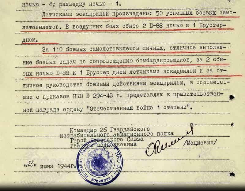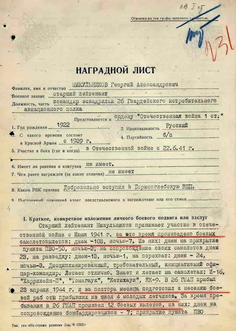 23.06.1944 командир эскадрильи 26-го гвардейского иап ПВО 2-го гиак ПВО Ленинградской армии ПВО гвардии старший лейтанант Никульников Г.А. представлен к награде.