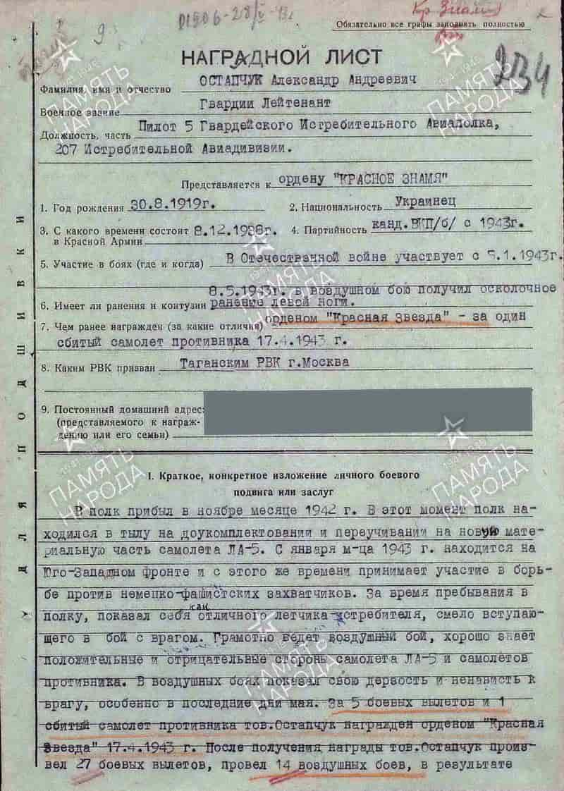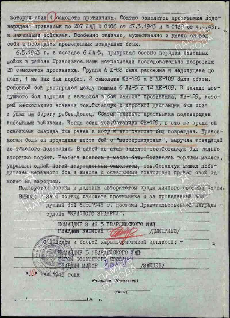 10.05.1943 пилот 5 гиап гвардии лейтенант Остапчук А.А представлен к награде.