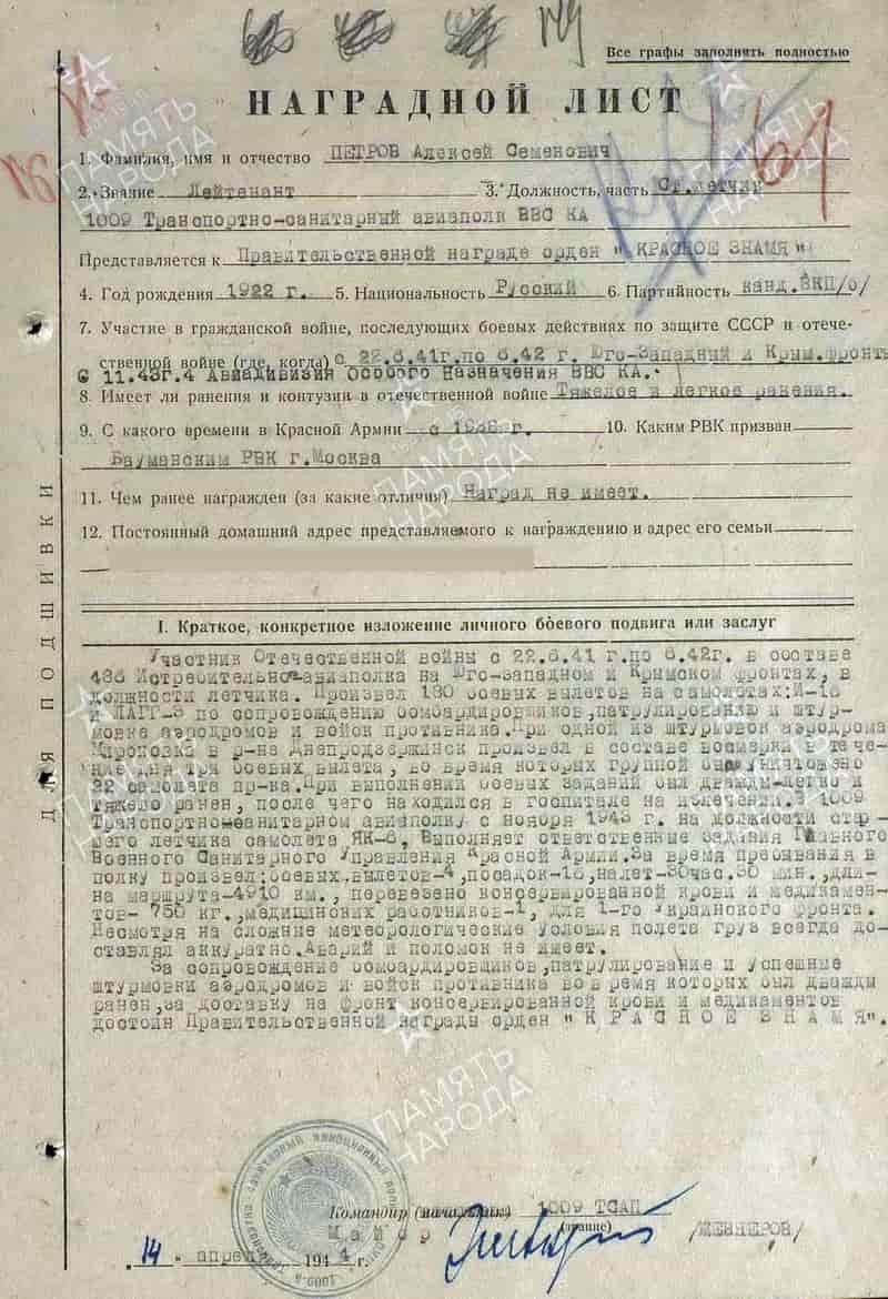14.04.1944 старший лётчик 1009-го тсап лейтенант Петров А.С. представлен к награде.