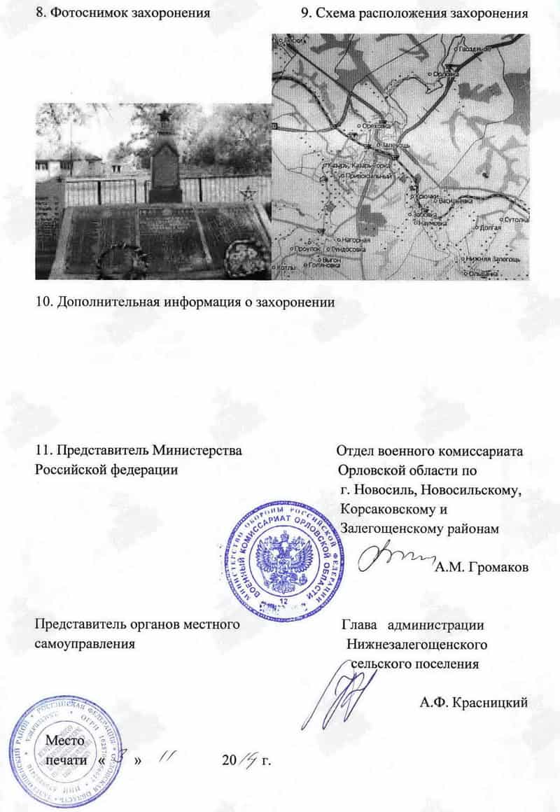Захоронен в Братской могиле в с. Нижнее Скворчье Залегощенского района Орловской области, захоронение № 89506710 (указана дата гибели 09.03.1943).
