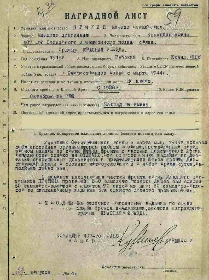 29.08.1944 командир звена 107-го оапс 14-й ВА 3-го Прибалтийского фронта младший лейтенант Пряхин М.В. представлен к награде.