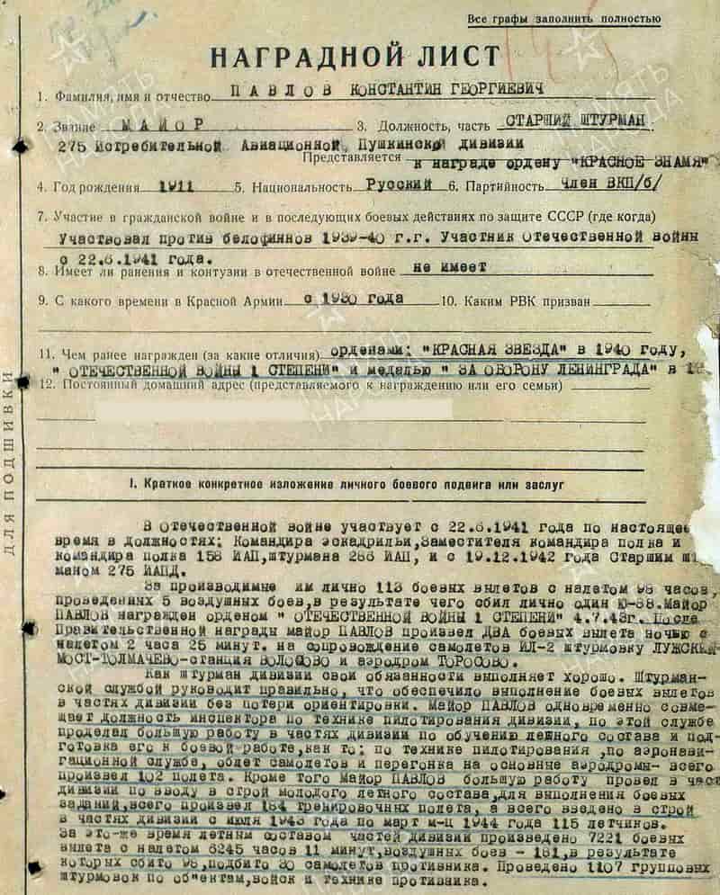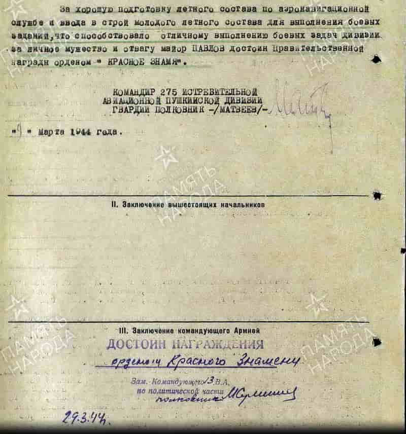 09.03.1944 старший штурман 275 иад майор Павлов К.Г. представлен к награде.