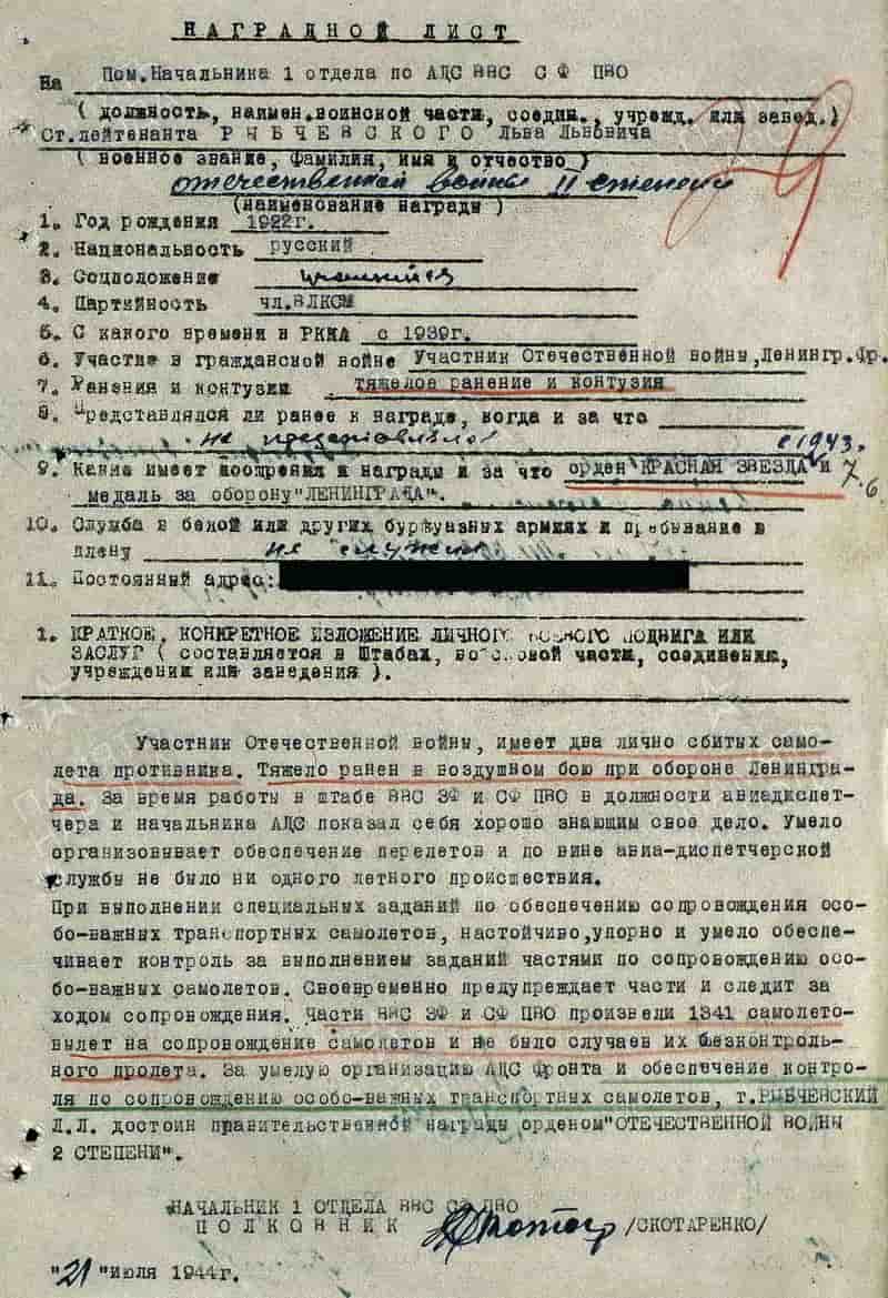 21.07.1944 помощник начальника 1-го отдела по авиационно-диспетчерской службе ВВС Северного фронта ПВО старший лейтенант Рыбчевский Л.Л. представлен к награде.