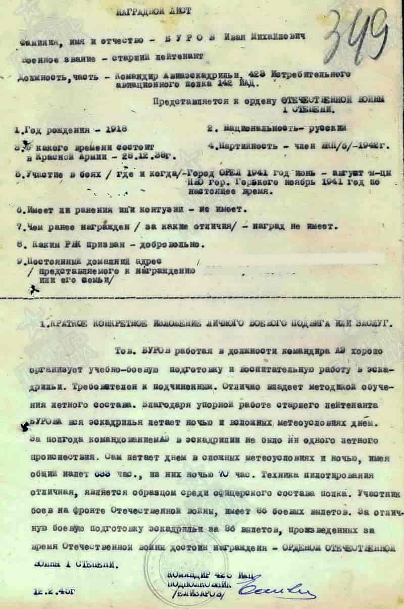 За время войны командир эскадрильи 423 иап ПВО старший лейтенант Буров И.М. выполнил 86 боевых вылетов, общий налет 633 часа, из них 70 часов ночью (по данным наградного листа 12.02.1945).
