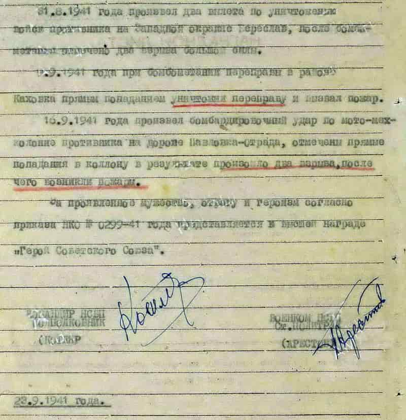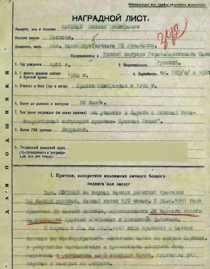 23.09.1941 заместитель командира ночного скоростного бомбардировочного авиационного полка Южного фронта капитан Постнов М.Д. представлен к присвоению звания Героя Советского Союза.