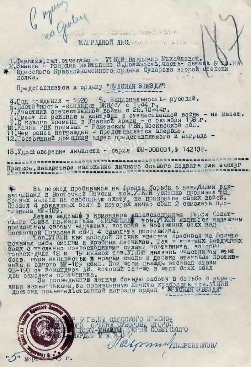 05.03.1945 командир звена 9 гиап гвардии лейтенант Уткин В.М. представлен к награде.
