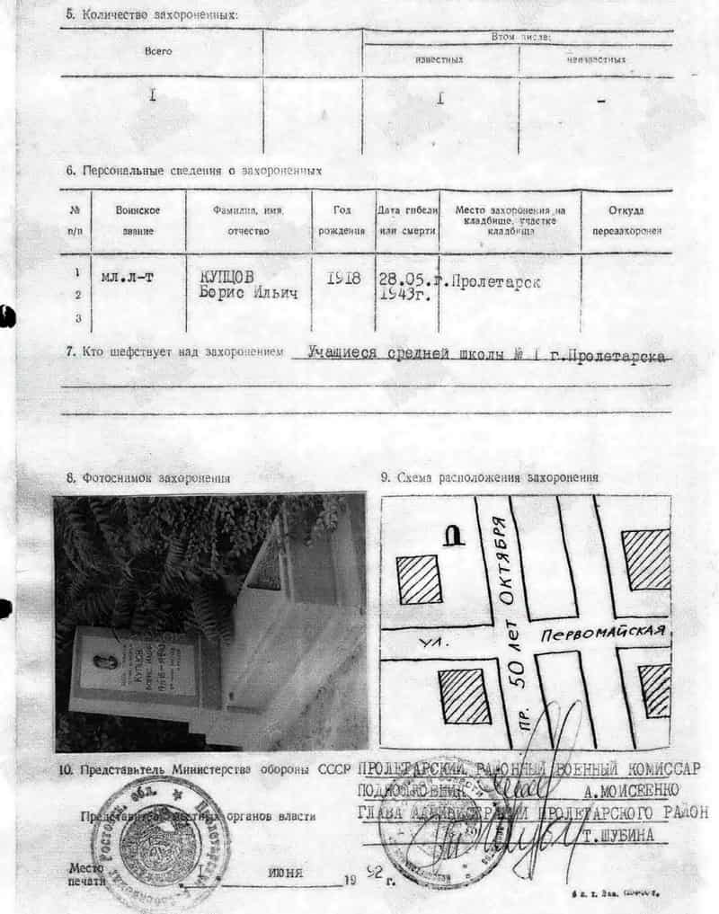 Именем Купцова Бориса Ильича названа одна из улиц г. Пролетарска Ростовской области.