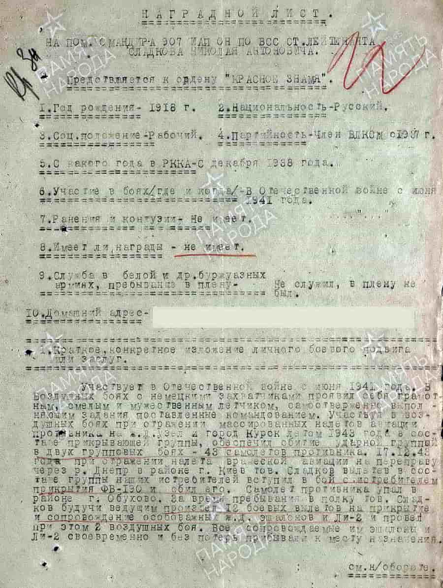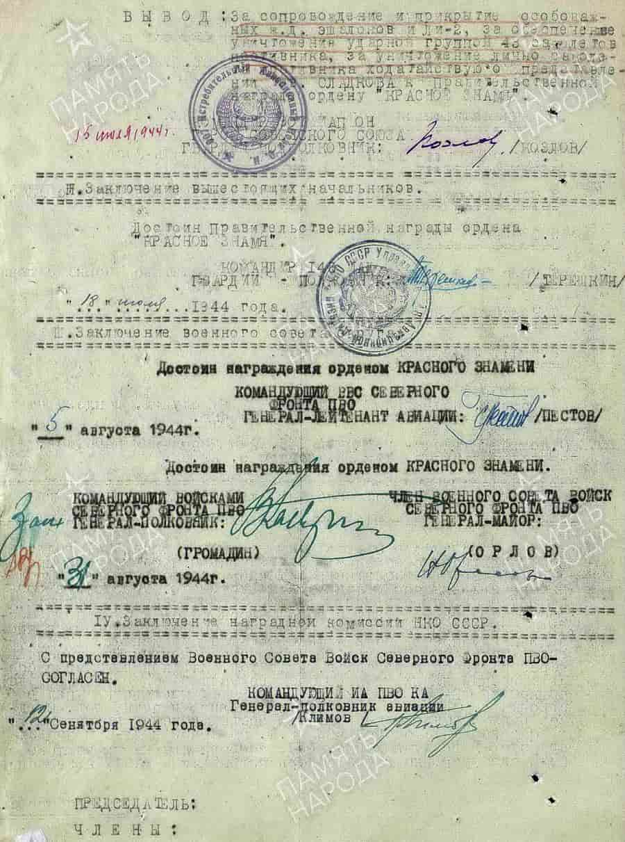 15.07.1944 помощник командира 907-го иап ПВО 148 иад ПВО Северного фронта ПВО по воздушно-стрелковой службе старший лейтенант Сладков Н.А. представлен к награде.