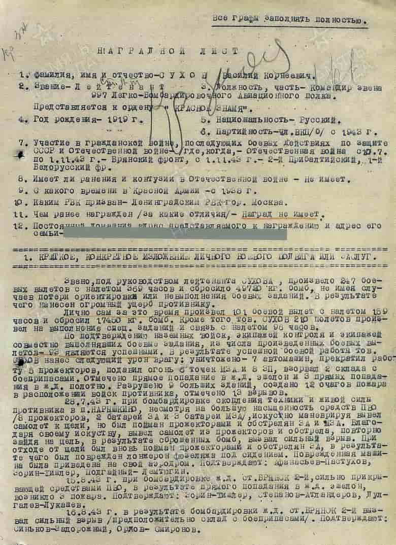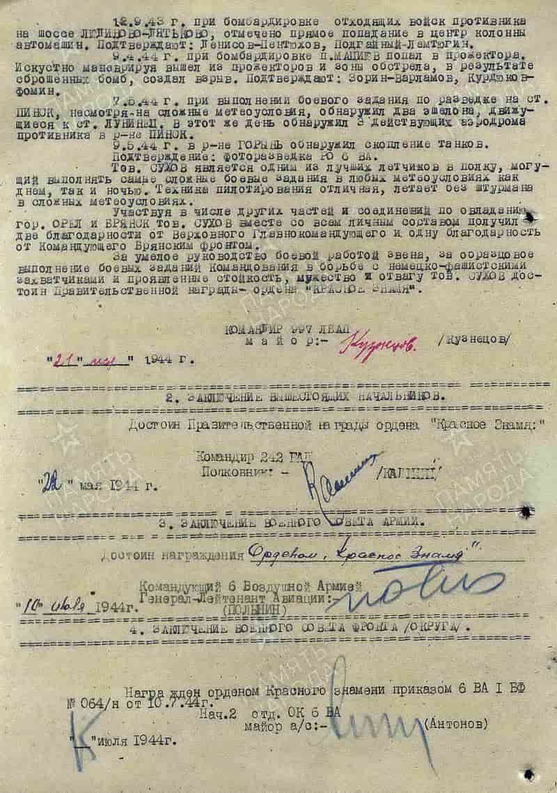21.05.1944 командир звена 997 нбап 242 нбад 6-й ВА 1-го Белорусского фронта лейтенант Сухов В.К. представлен к награде.