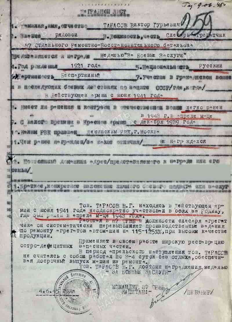 По данным наградного листа в апреле 1943 года рядовой Тарасов В.Г. получил лёгкое ранение.