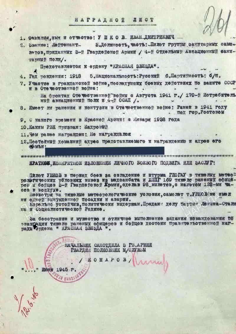 В УПК есть запись из свидетельства № 77 от 10.04.1944 госпиталей ЭГ 5777, ЭГ 3319 о признании лётчика 4 осап лейтенанта Ушкова И.Д. негодным к лётной работе. 10.06.1945 пилот 4-го отдельного авиационного санитарного полка при 3-й гвардейской армии лейтенант Ушков И.Д. представлен к награде.