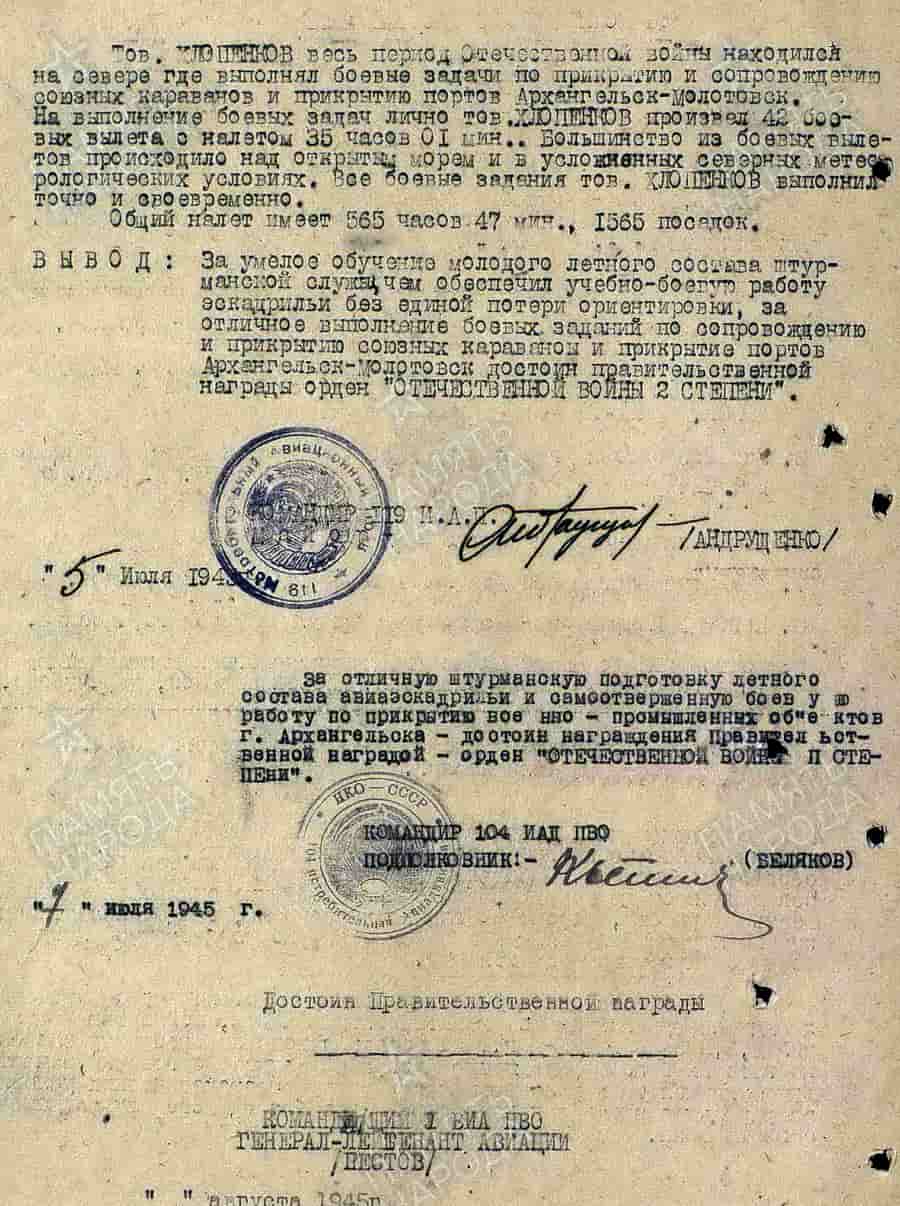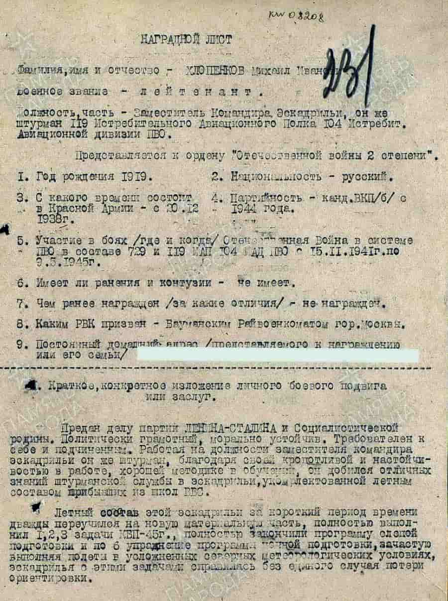 05.07.1945 заместитель командира, штурман эскадрильи 119-го иап ПВО 104 иад ПВО лейтенант Хлопенков М.И. представлен к награде. За время войны выполнил 42 боевых вылета с налётом 35 часов 1 минута. Общий налёт 565 часов 47 минут (1.565 посадок).