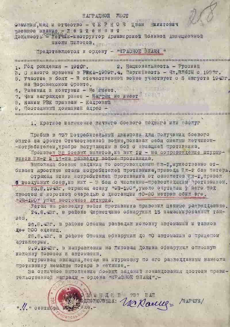 11.09.1943 лётчик-инструктор Армавирской ВАШП лейтенант Чернов И.Н. представлен к награде.