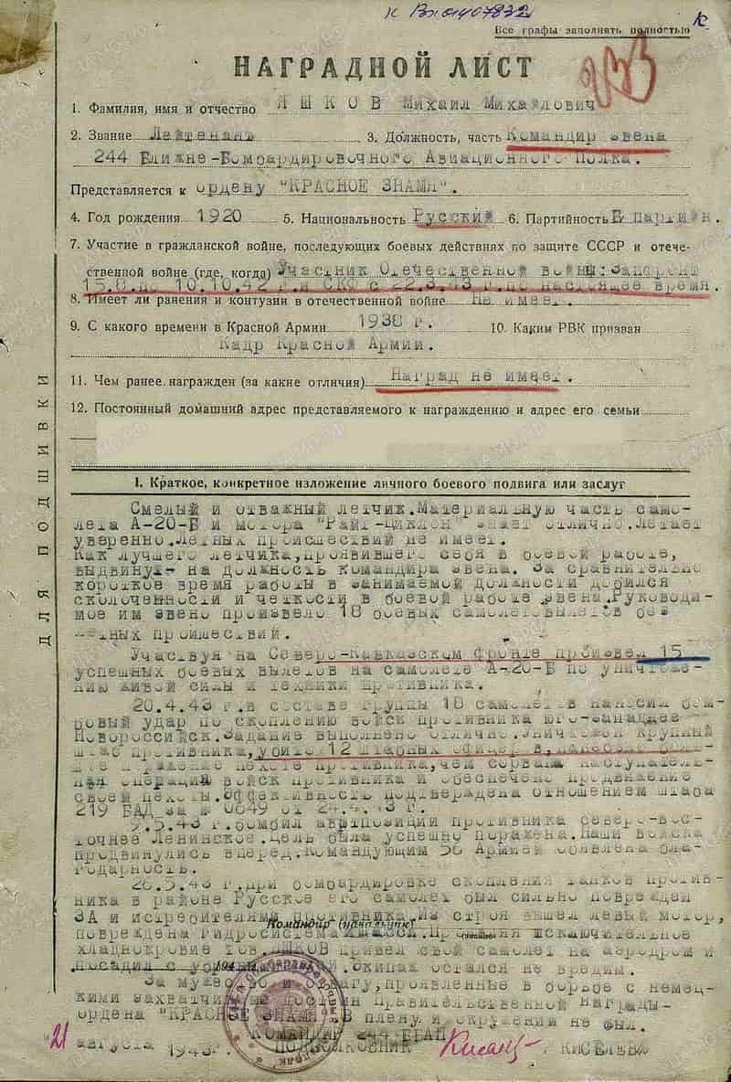 21.08.1943 командир звена 244 ближне-бомбардировочного авиационного полка 219 бад Северо-Кавказского фронта лейтенант Яшков М.М. представлен к ордену Красного Знамени и 08.10.1943 награждён орденом Красной Звезды.