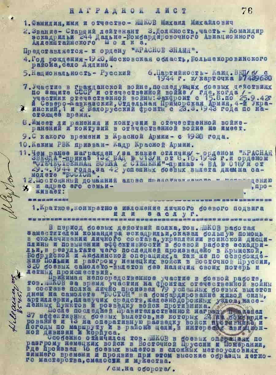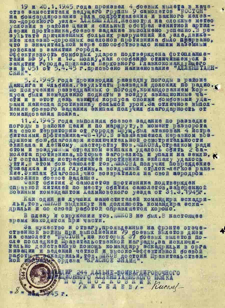 08.05.1945 командир эскадрильи 244 дальне-бомбардировочного авиационного полка 132 бад 5 бак 4-й ВА 2-го Белорусского фронта старший лейтенант Яшков М.М. представлен и 05.06.1945 награждён орденом Красного Знамени.