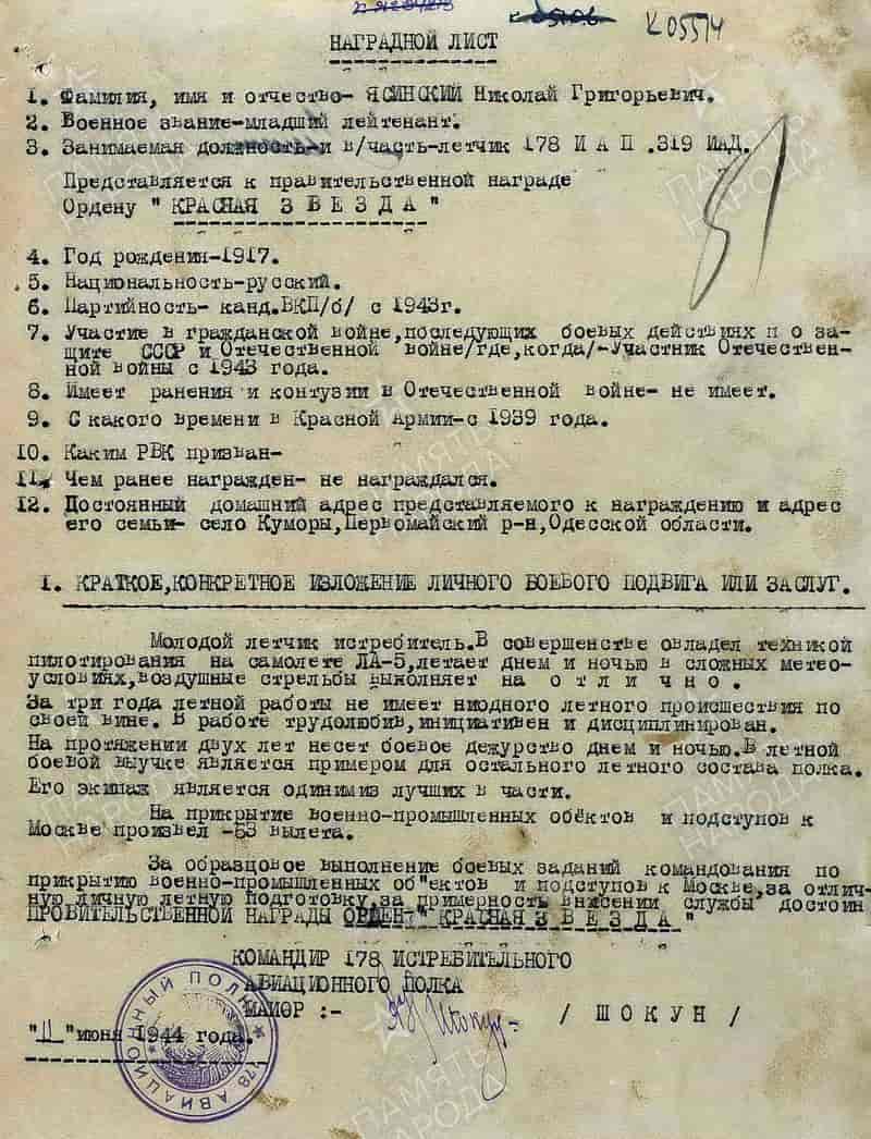 21.07.1943 младший лейтенант Ясинский Н.Г. прибыл в 178-й иап 319 иад ПВО. К июню 1944 года выполнил 63 боевых вылета.