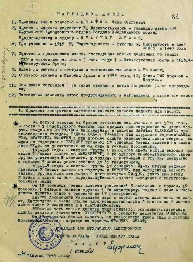 30.04.1945 командир звена 106-го шап 300 шад 9 шак 16-й ВА 1-го Белорусского фронта младший лейтенант Шкатов Я.С. представлен к награде.