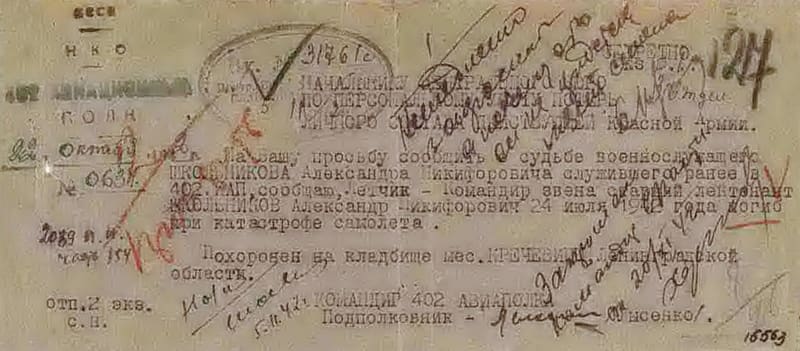 По уточненным данным, 24 июля 1942 года (по записи в УПК дата гибели 23.07.1941) лётчик (командир звена) 402 иап старший лейтенант Школьников Александр Никифорович погиб при вынужденной посадке самолёта на Северо-Западном фронте.