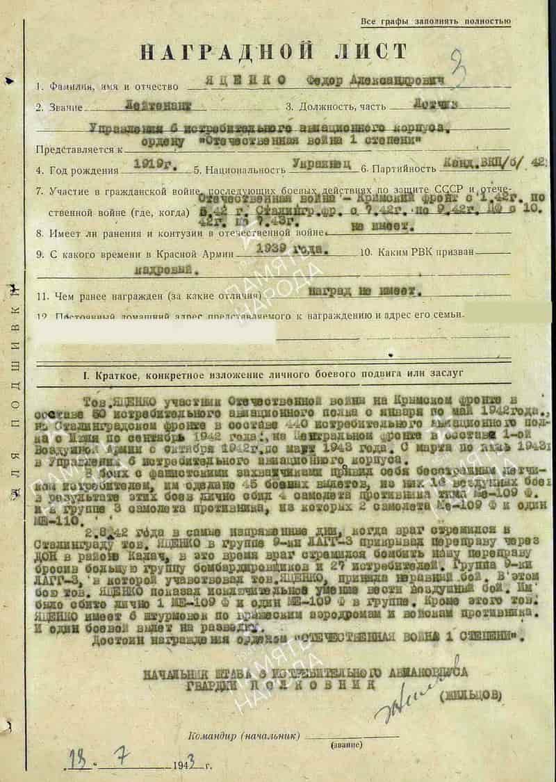 18.07.1943 лётчик звена связи управления 6 иак ПВО лейтенант Яценко Ф.А. представлен к награде.