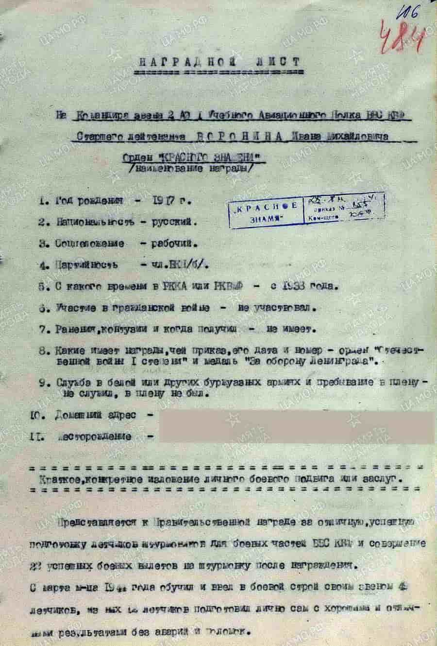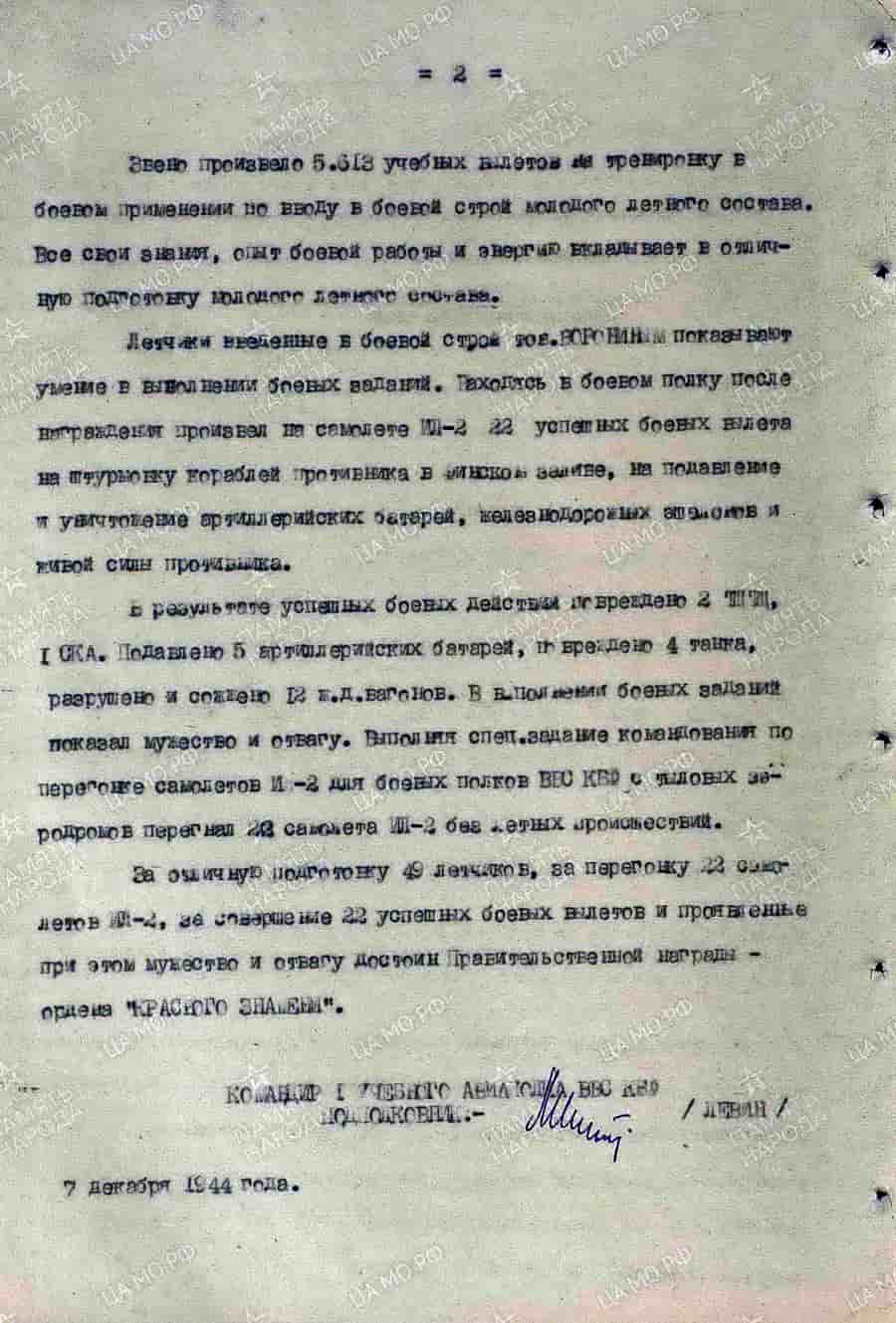 07.12.1944 командир звена 2-й эскадрильи 1-го уап ВВС КБФ гвардии старший лейтенант Воронин И.М. представлен к награде.